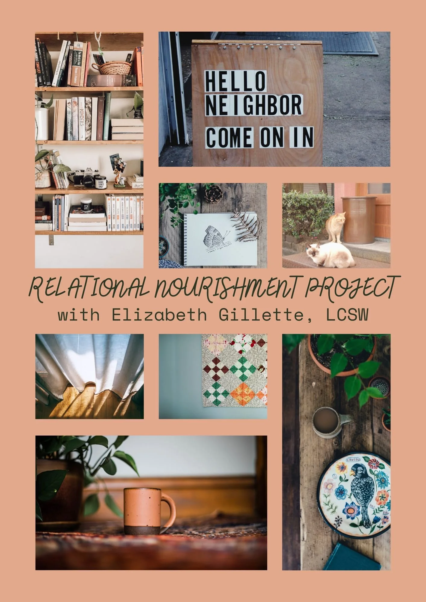 We will connect and come together for 6 months. Each month will have a theme that we will dig into and reflect on. We will meet as a group several times during the month, including bonus gatherings that you are welcome to join if you choose (Candelight yoga! Shared meals! Co-working/body doubling! Morning coffee!). The Relational Nourishment Project will also have private podcast episodes designed especially for this program. Finally, there will be a group messaging board to stay connected between meetings to share resources, information, and reflections.